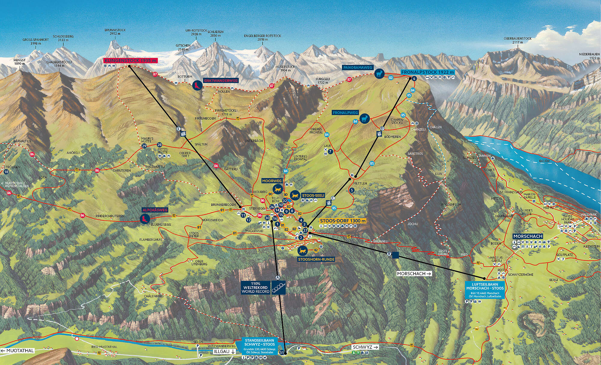 Es importante que sepas que puedes subir tanto a Fronalpstock como a Klingenstock desde Stoos, dependiendo en qué sentido quieras realizar la caminata; lo mismo aplica para bajar. Te dejo un mapa de la zona para que puedas visualizarlo mejor.