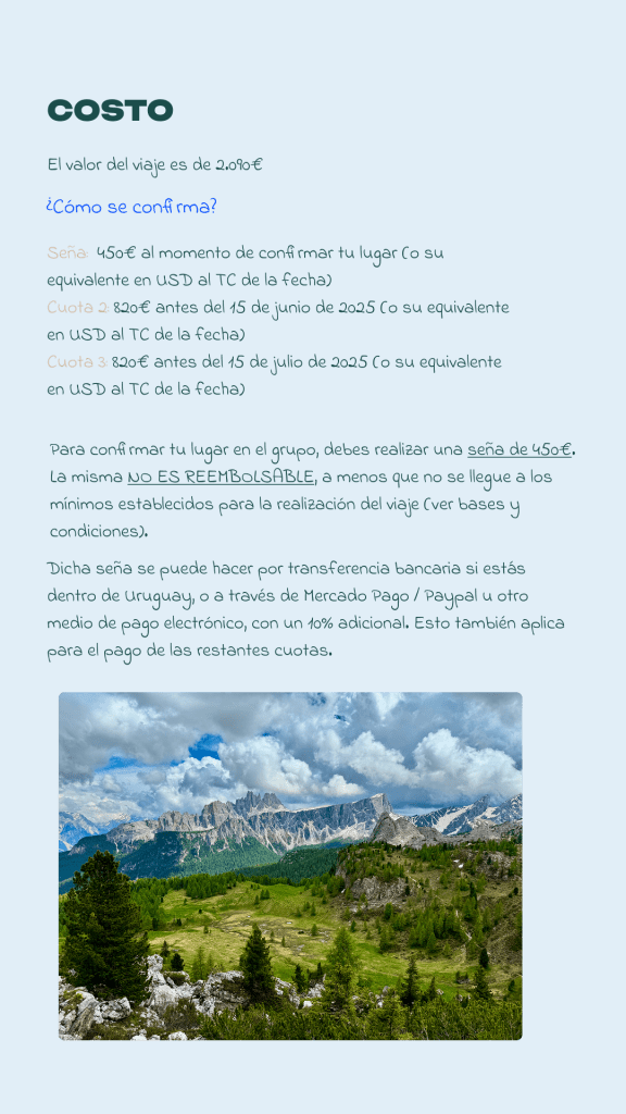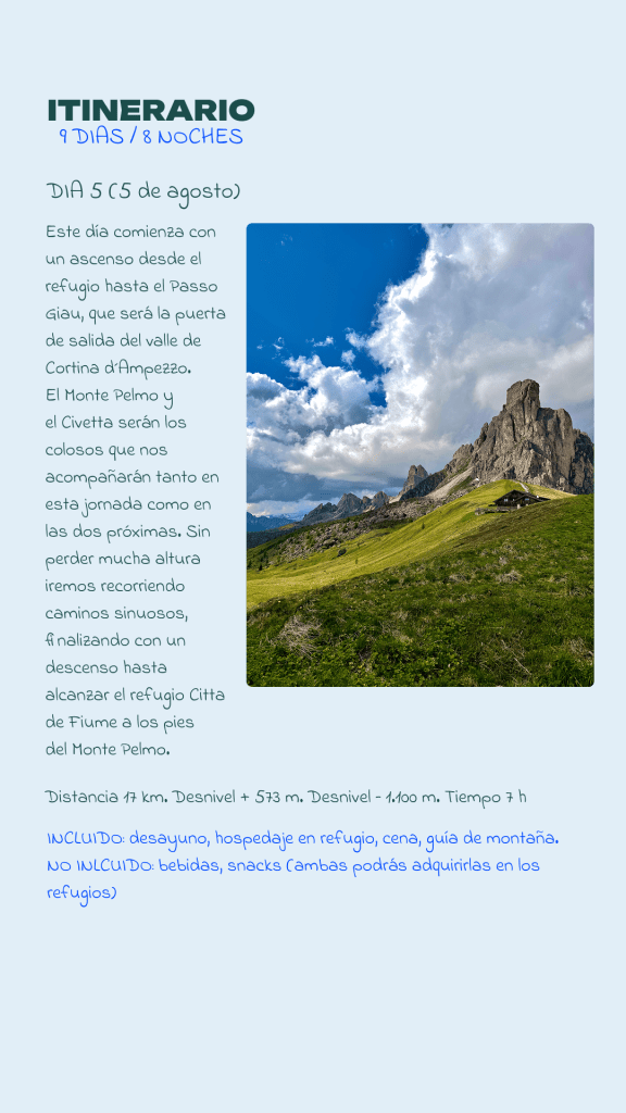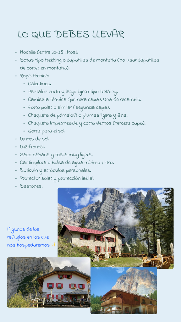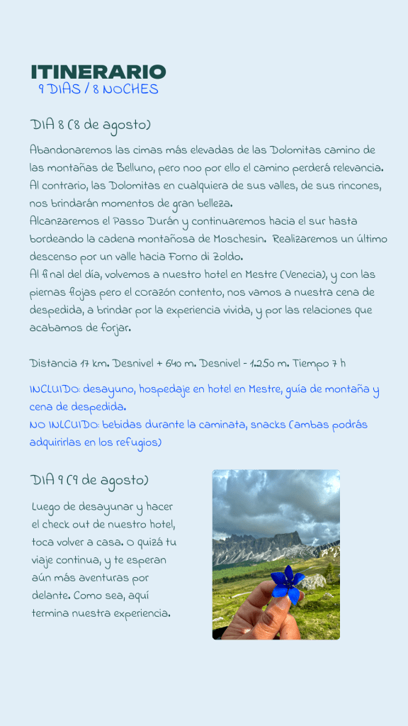 La Alta Vía 1 es una de las rutas más icónicas de los Alpes Italianos; un sendero que te llevará a través de imponentes montañas, lagos de aguas cristalinas y acogedores refugios de montaña. Este viaje es una oportunidad para conectar contigo misma, con la naturaleza y con un grupo de mujeres apasionadas por la aventura.
